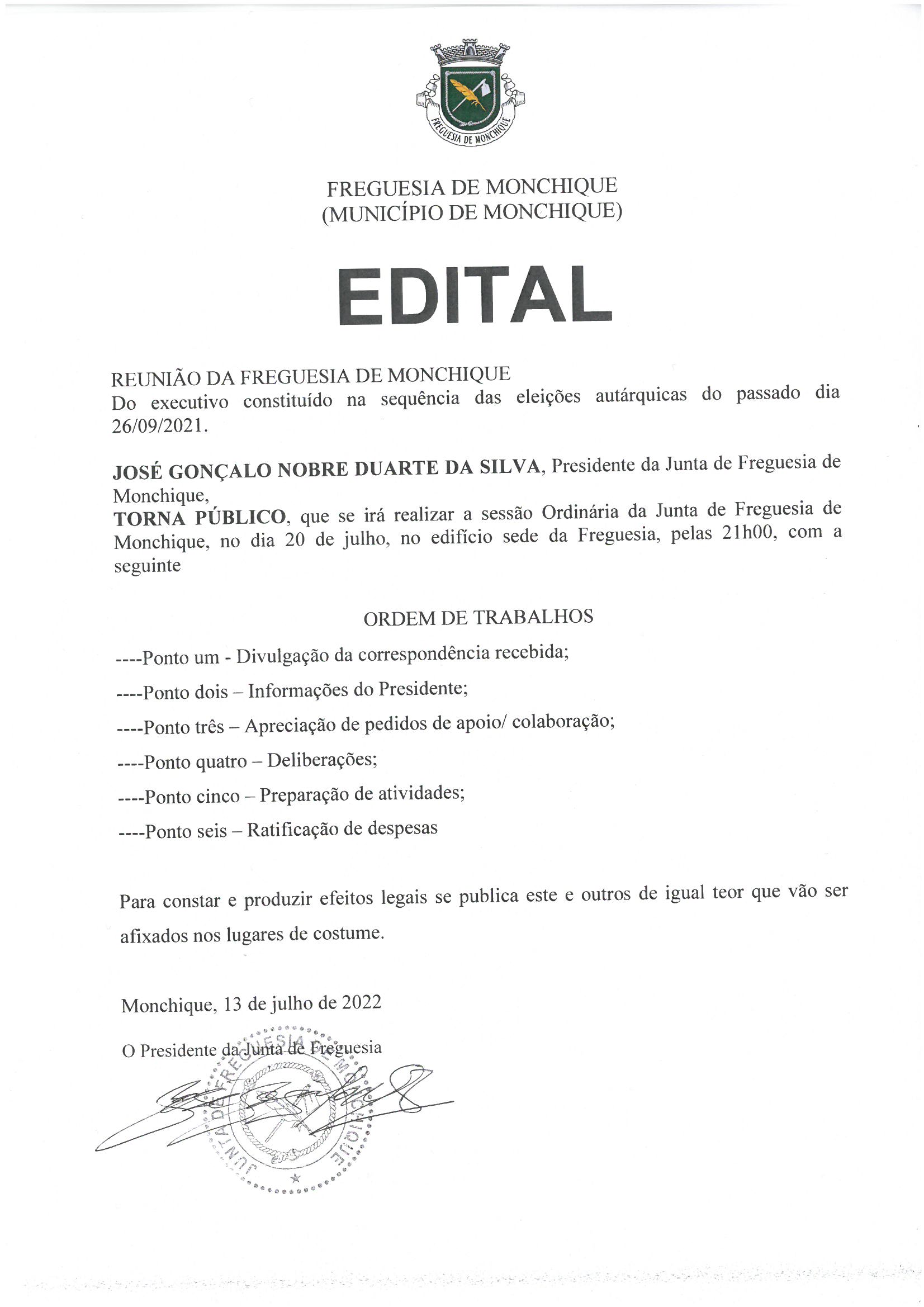 Reunião Ordinária da Junta de Freguesia de Monchique – 20-07-2022, 21h00