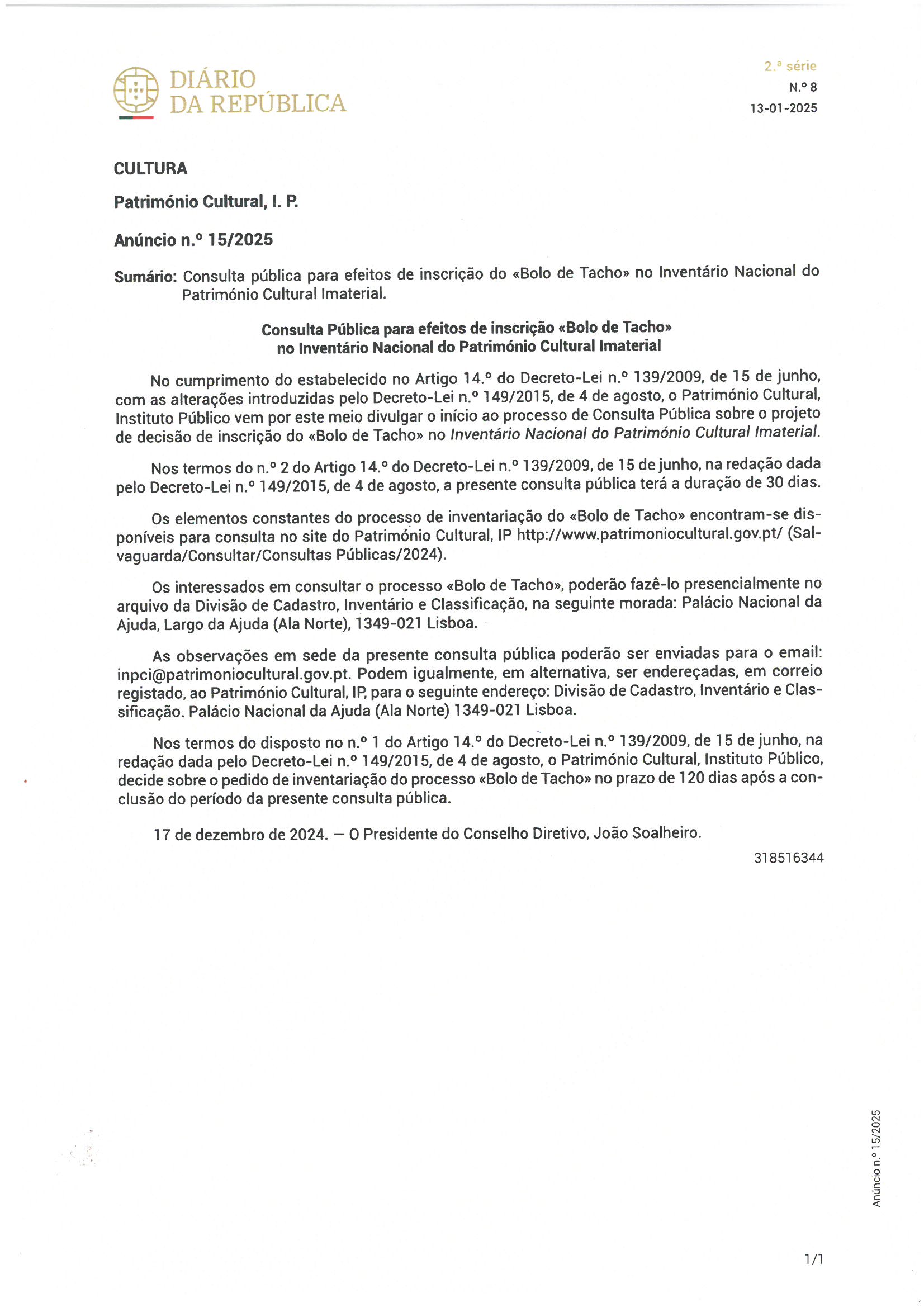 A Junta de Freguesia de Monchique congratula-se com a publicação à data de hoje no Diário da República – 2ªsérie – nº8 do Anúncio nº15/2025, que inicía o período de 30 dias para Consulta Pública para efeitos de inscrição do «Bolo de Tacho» no Inventário Nacional do Património Cultural Imaterial.